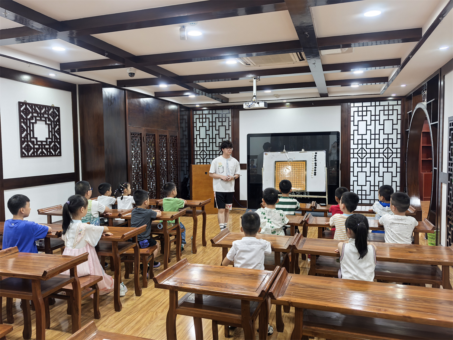 课上,老师以生动有趣的方式为孩子们讲述了围棋的起源与发展。从尧舜时期的传说到“琴棋书画”四艺的文化地位,从黑白棋子的哲学内涵到棋盘上的“天圆地方”,孩子们在故事中了解到围棋不仅是竞技游戏,更是承载中华文明的精神符号。通过互动问答,深入浅出地讲解了围棋礼仪、基本规则及“打吃”“提子”等技巧,现场气氛热烈非凡。